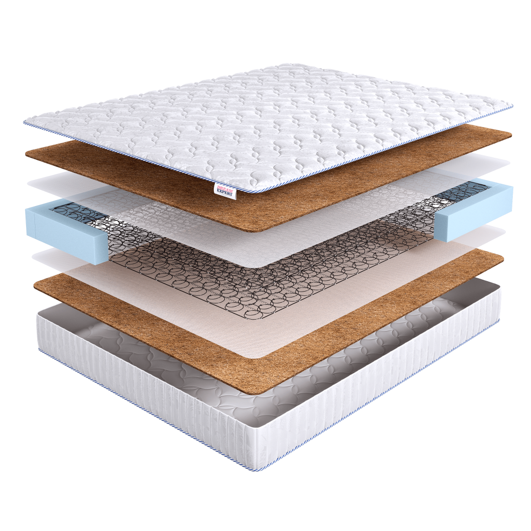Латексированная кокосовая койра в сочетании с классическим зависимым пружинным блоком Bonnel придает матрасу упругость и жесткость выше средней, что обеспечивает эффективную поддержку тела спящего и правильное положение позвоночника на протяжении всей ночи.