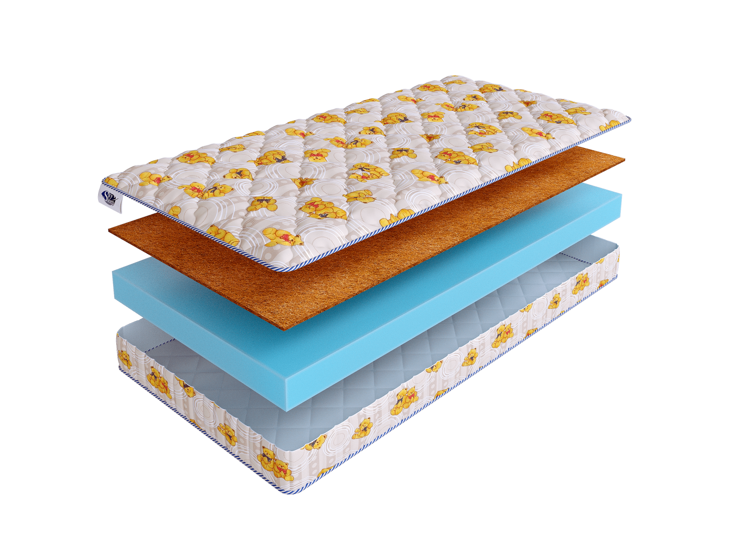 Основную высоту матраса задает блок средне-жесткой пены Orto Foam толщиной 10 см. С одной стороны он усилен сантиметровым слоем кокосовой койры. Кокосовая койра придает матрасу жесткость и делает его более ортопедичным. Оба материала отлично «дышат», что позволяет всегда поддерживать гигиену спального места малыша. Матрас подходит для малышей от рождения.
